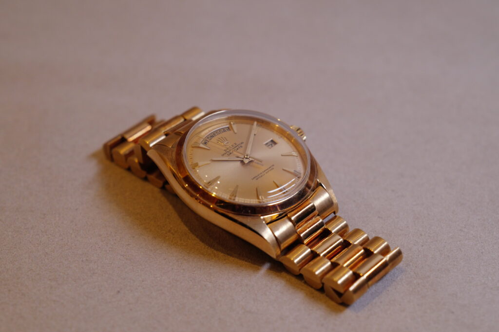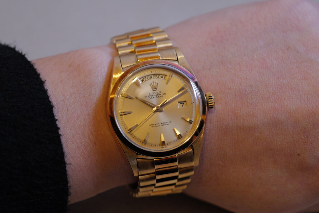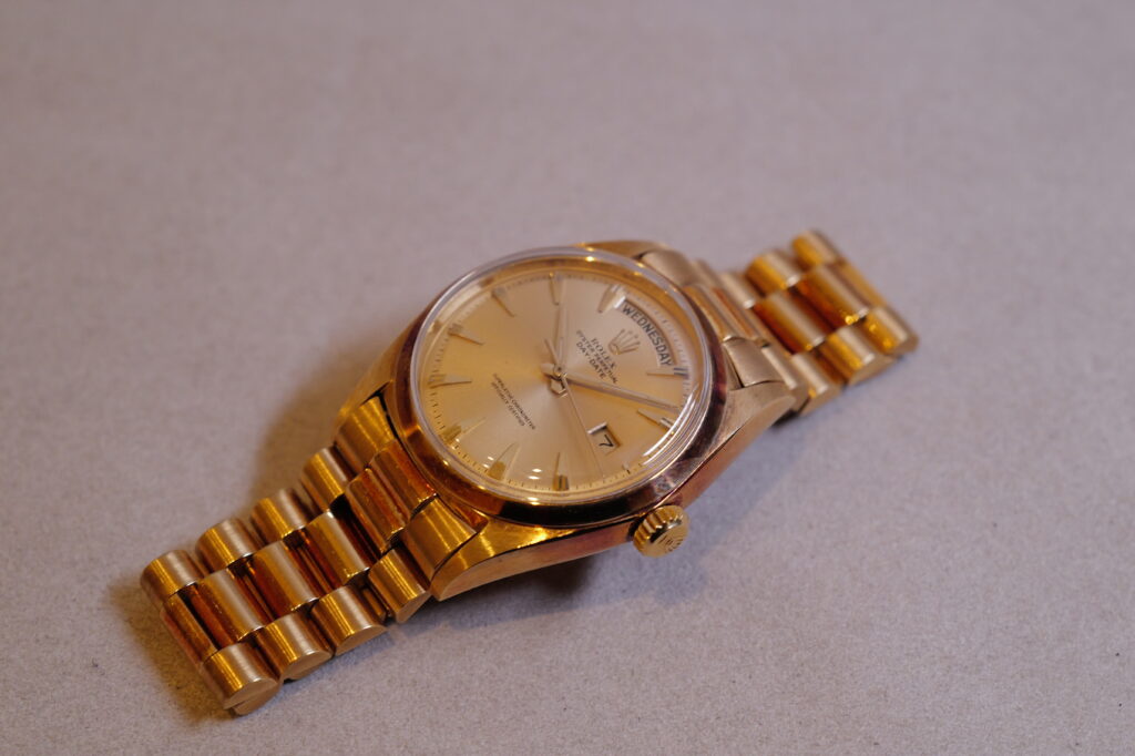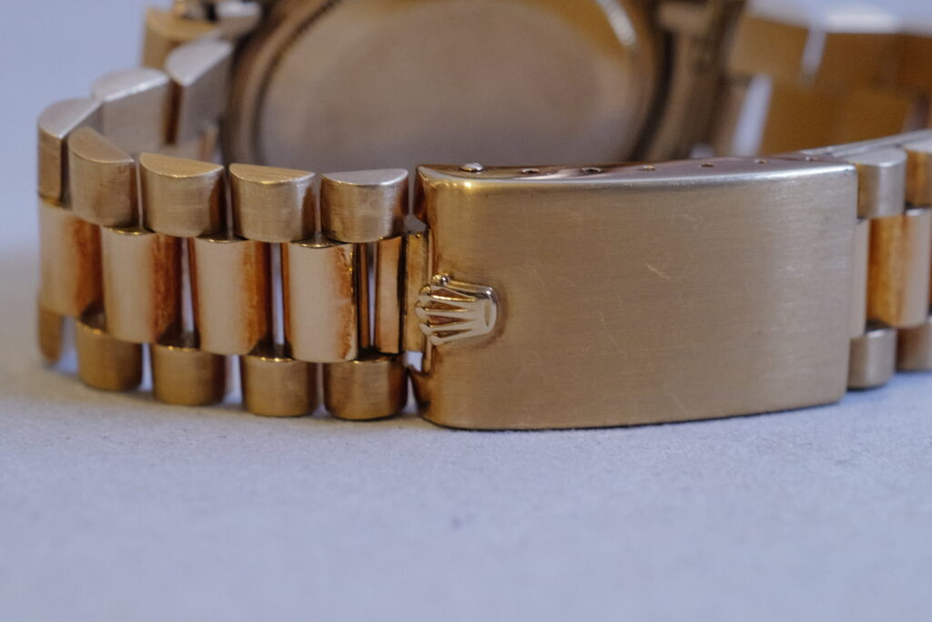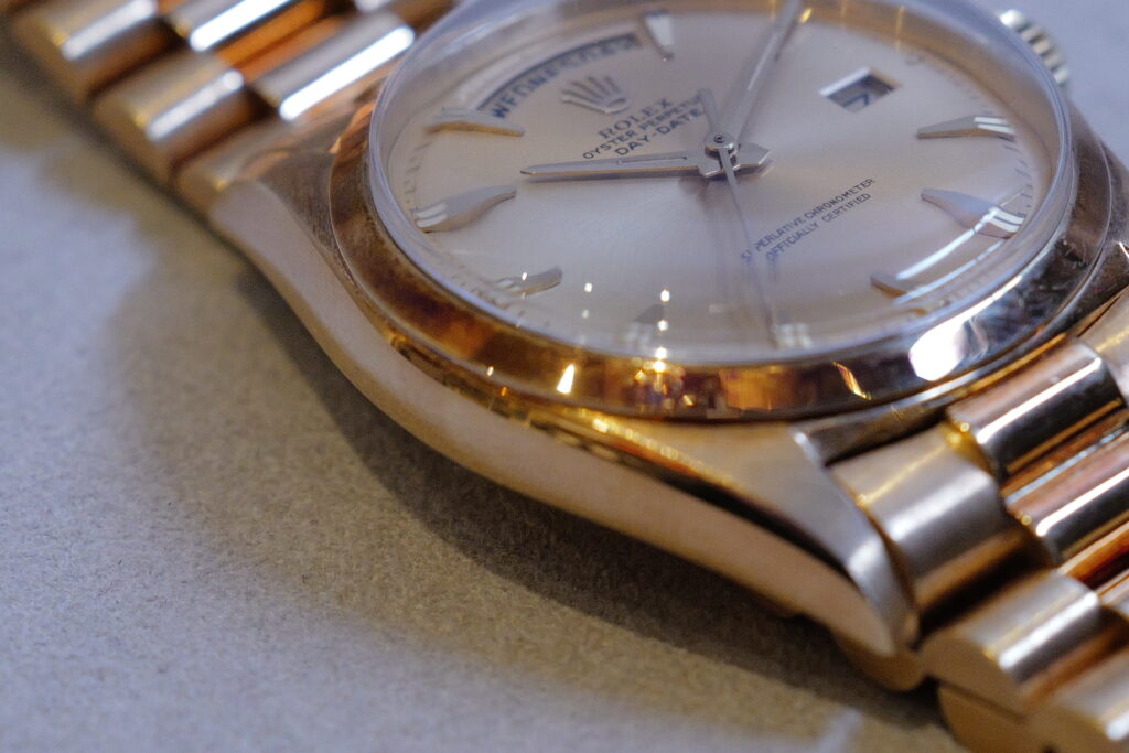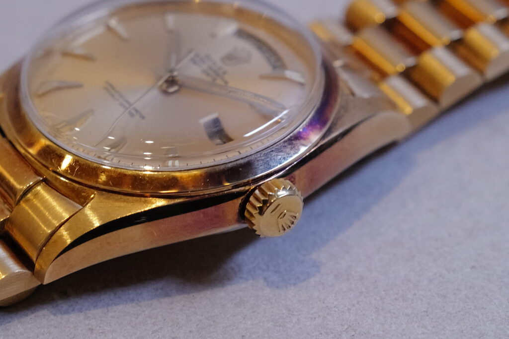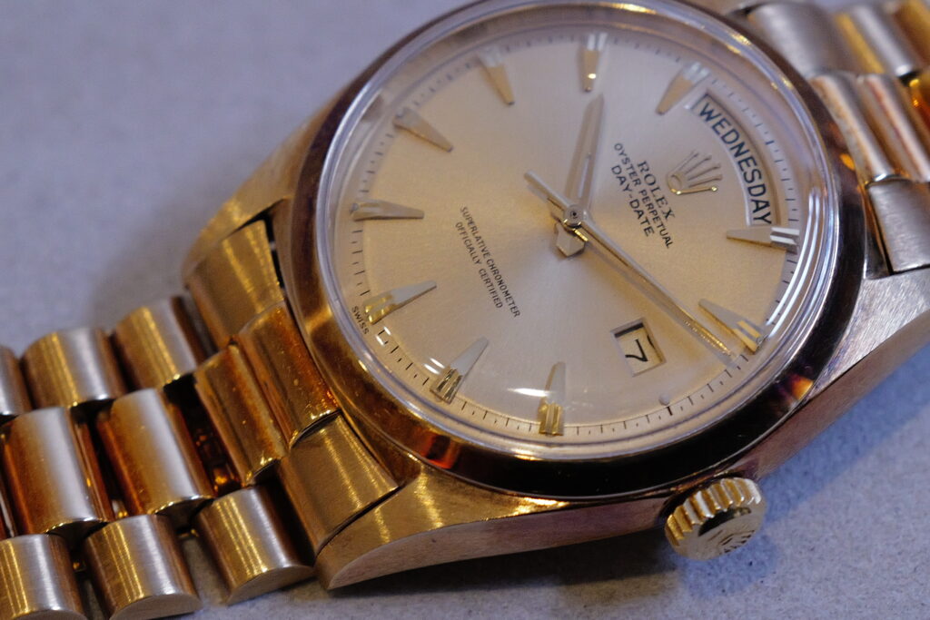 美しく金焼けしたスムースベゼル仕様のRef.1802 Day Date。