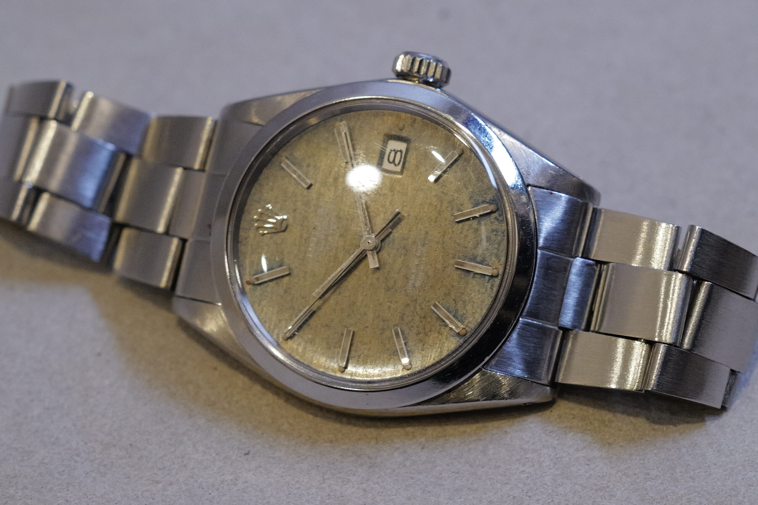 本来ブルーのモザイクダイヤルが経年変化により美しくグリーングレーの様な色目に変化した唯一無二のダイヤルです。