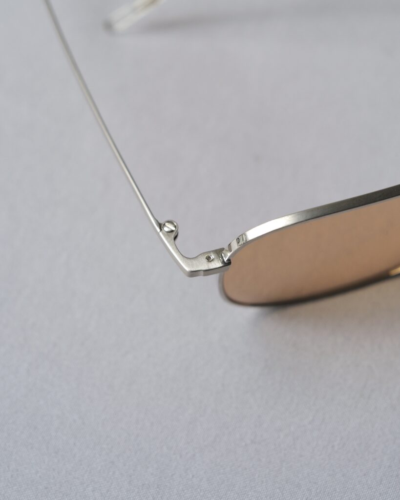 時代感に合わせ高そうに見せないために、アセテート削り出しでありながらチューブのようにそっけないモダンを採用する一方で、テンプルを内甲丸にしたり、しのみにドット柄を配したりと、ディテールには細やかな変化を見ることができます。
