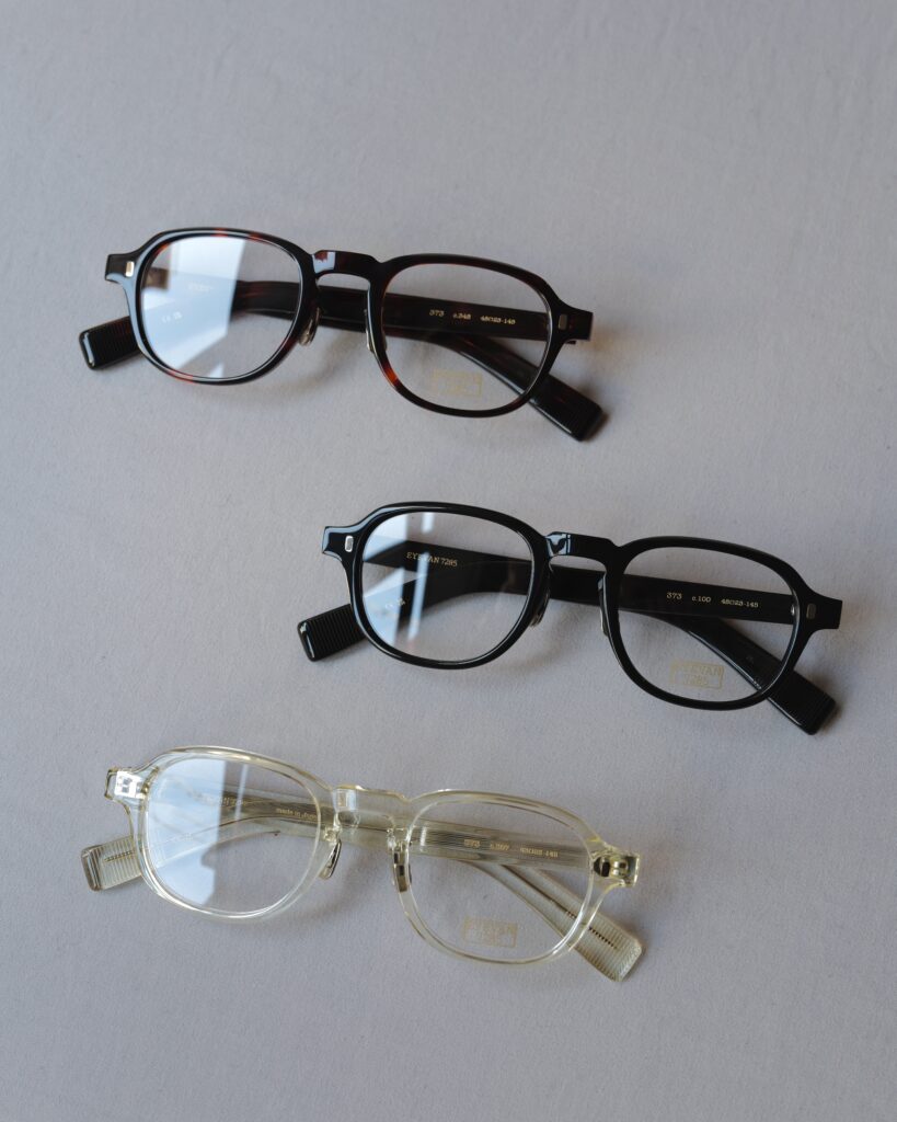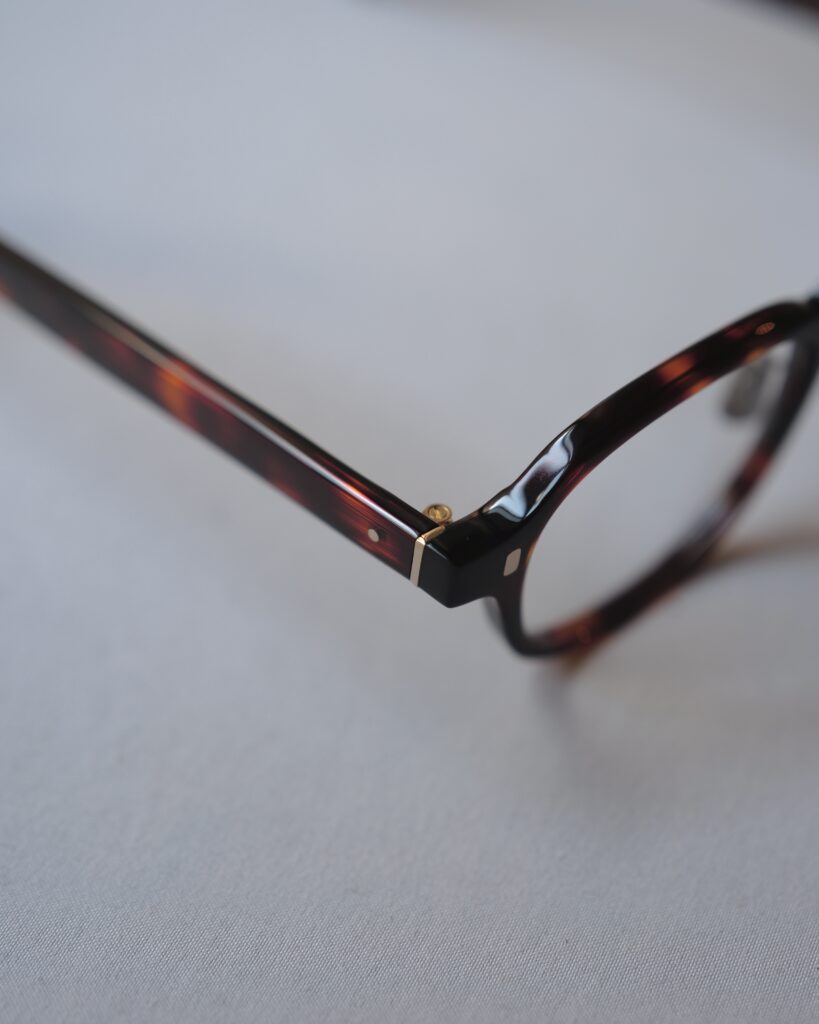 フロントとテンプルを金属製の蝶番とあわせて磨き上げ、合口を丁寧に合わせてから蝶番を低温メッキする伝統的な技法で仕上げた点がなによりの特徴。フロントのスクエア型のかしめも含めて、シャープで迷いのない智周りが印象的です。