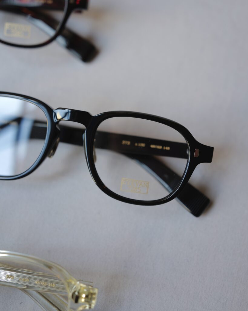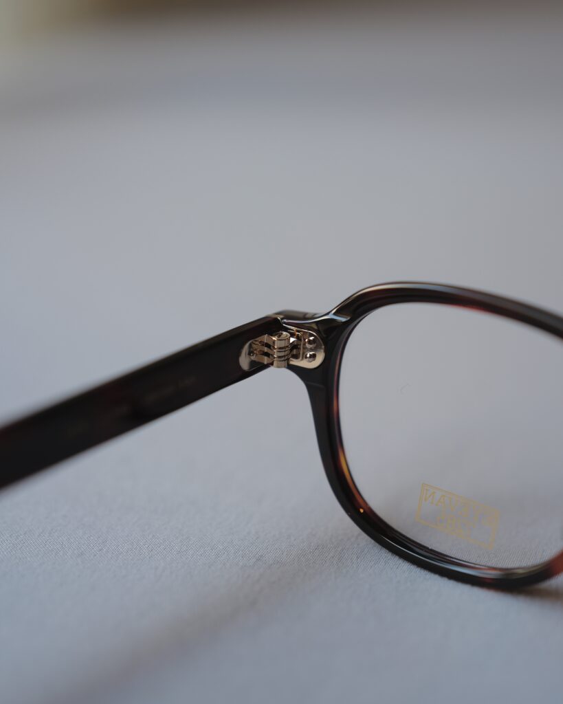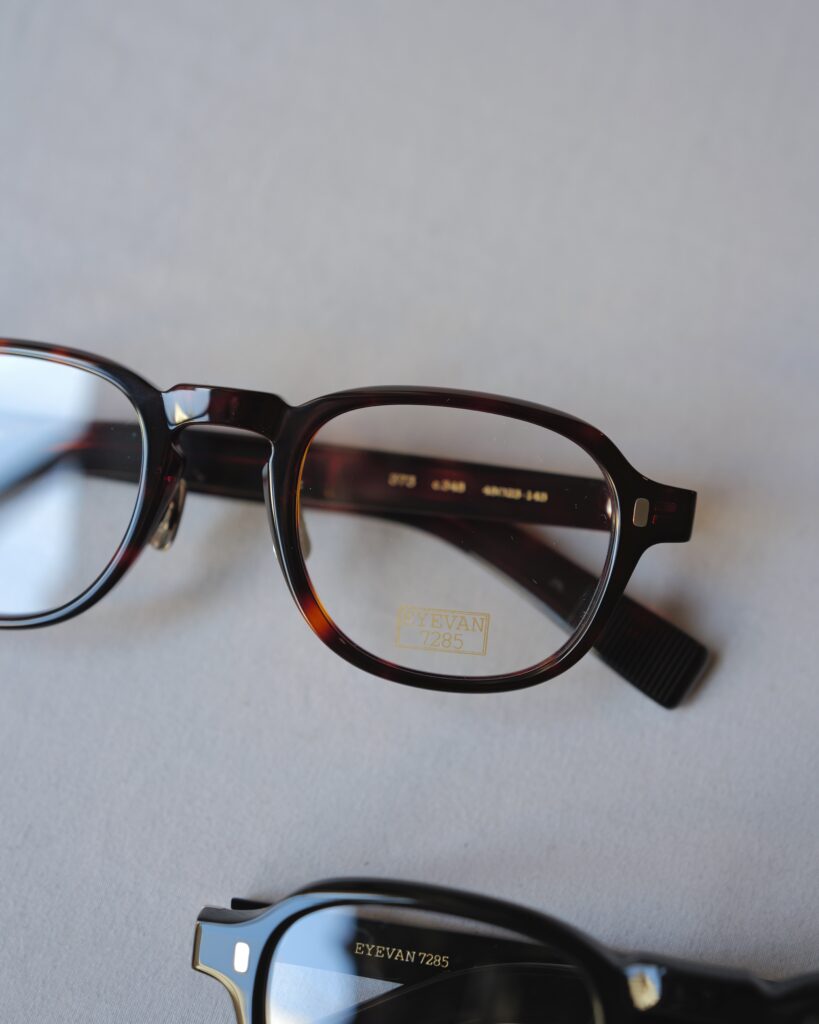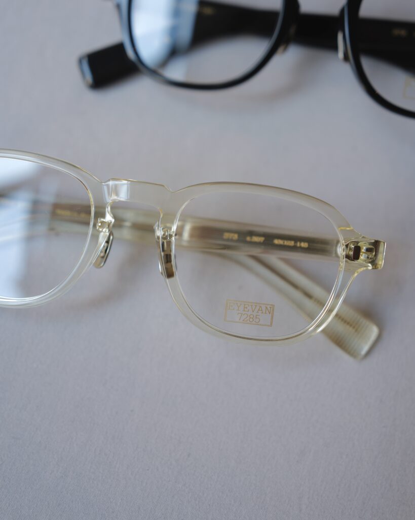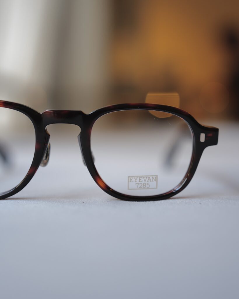 智以上にブリッジを太くデザインし、さらにキーホールをあしらうことで、あくまで智が目を引きすぎないようにしているのはいかにもEYEVAN 7285らしいポイントです。高めのブリッジと垂れた玉型がジャーマンデザインを想起させる、現代的に洗練された一本です。