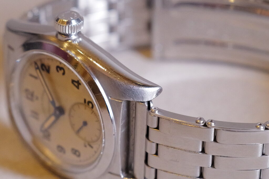 こちらはパウダー状のホワイトダイヤルで珍しいオールアラビックにスモールセコンドの仕様です。