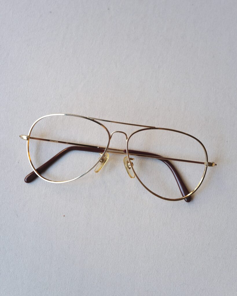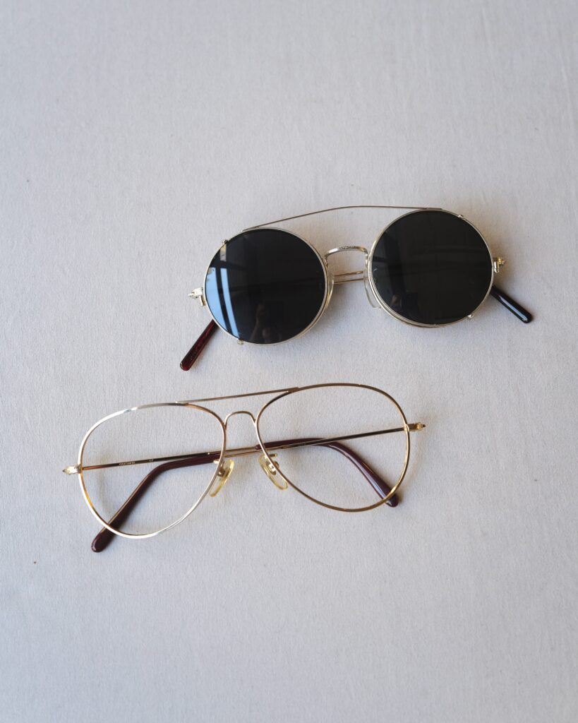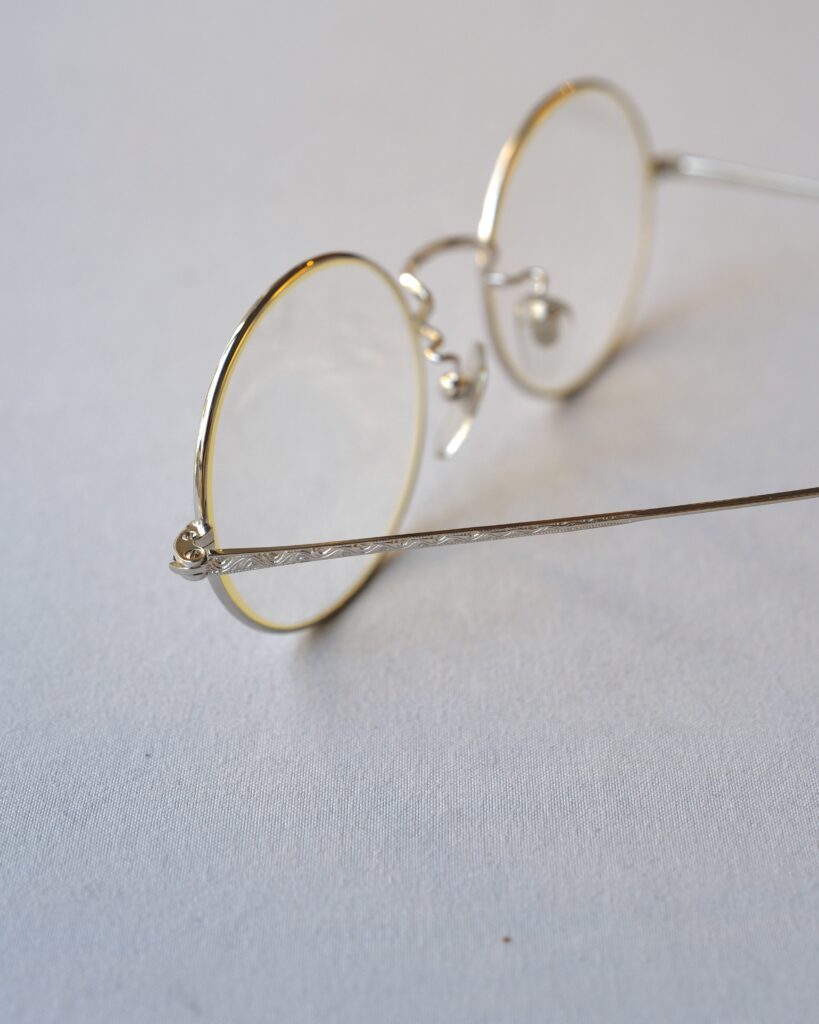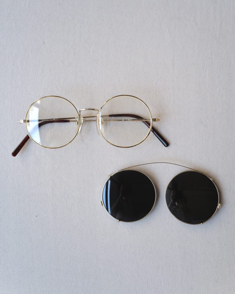 ラウンドシェイプの一本はEYEVAN CRAFTらしく、ブリッジやテンプルには彫金、クリップオンサングラスのリムにはミル打ち、さらに鼻パッドにまでオリジナルのEVロゴが入った、当時としては非常に凝った仕様。まさに現在のEYEVAN 7285に通ずるディテールの徹底ぶりです。またたっぷりとしたラウンドの玉型もオリジナリティを感じられるポイントではないでしょうか。