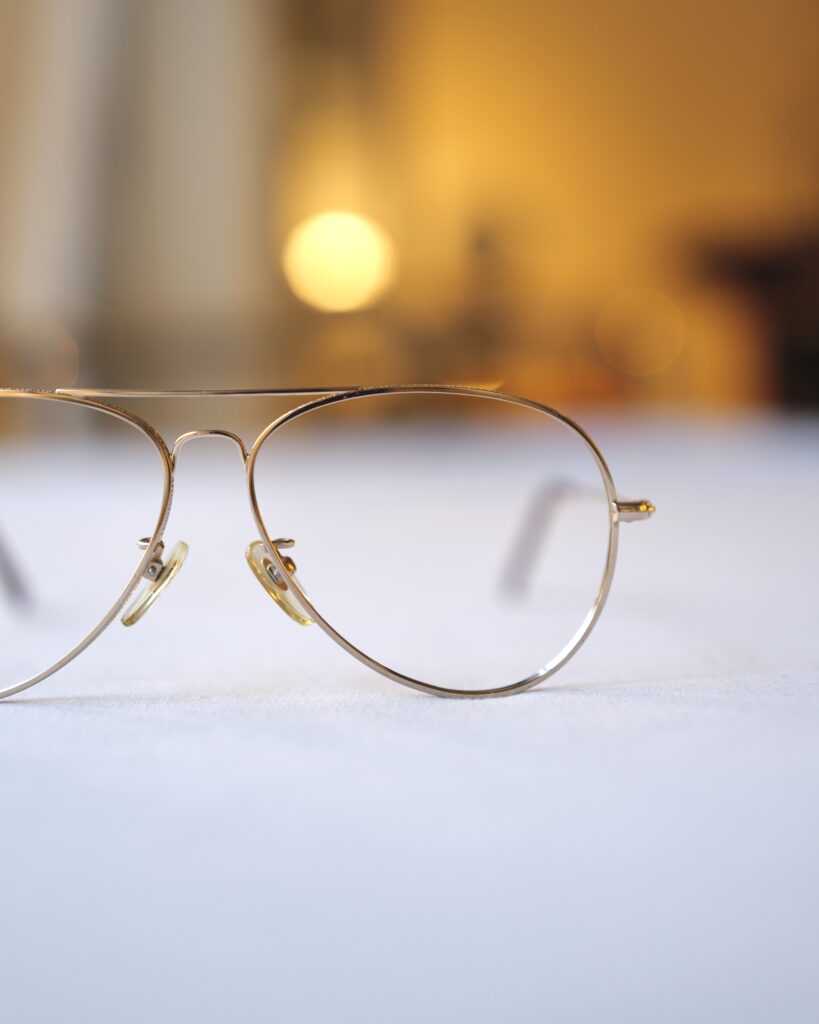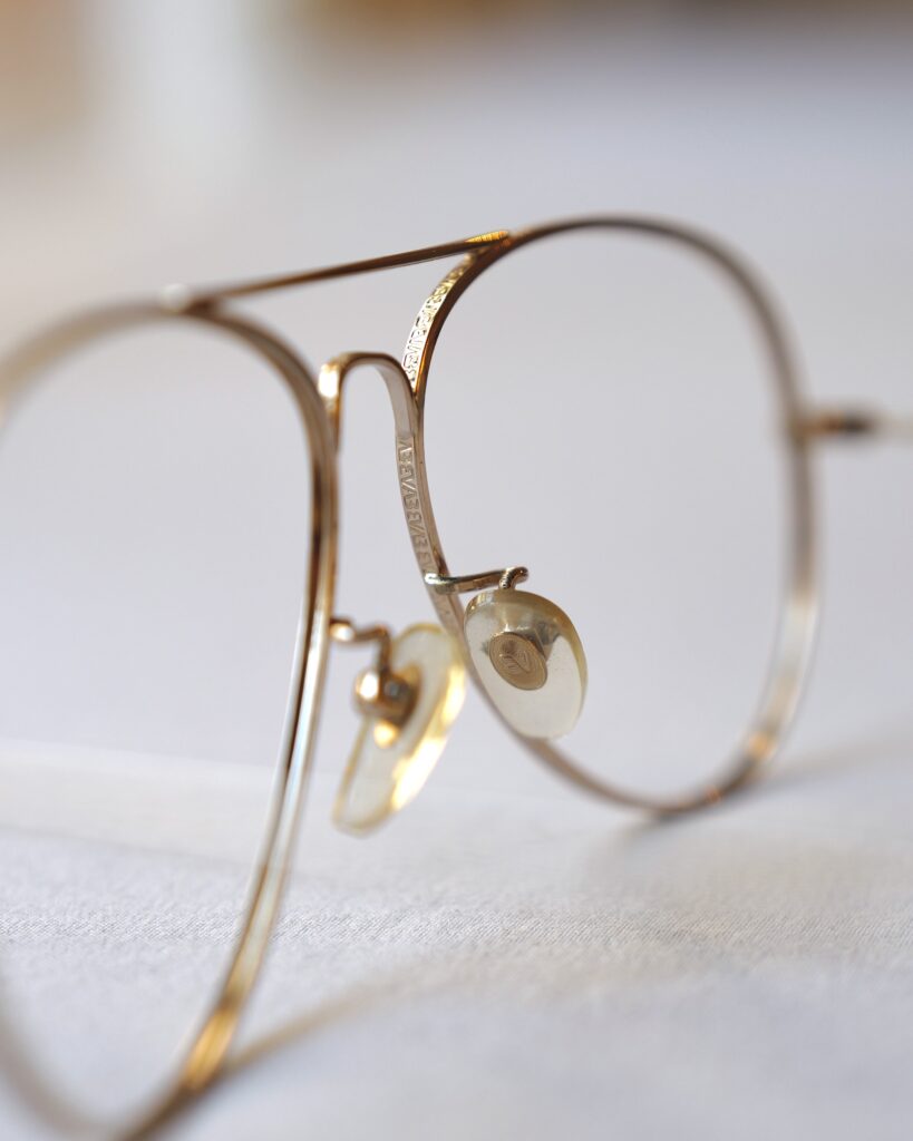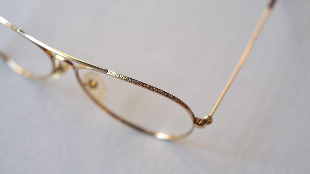 ティアドロップの一本は、当時高級紳士・婦人ラインとして展開されていたCOUTURIEラインのもの。こちらも鼻パッドにはオリジナルのEVロゴが入っており、さらに同じロゴがリム一周にぐるりと刻印されています。