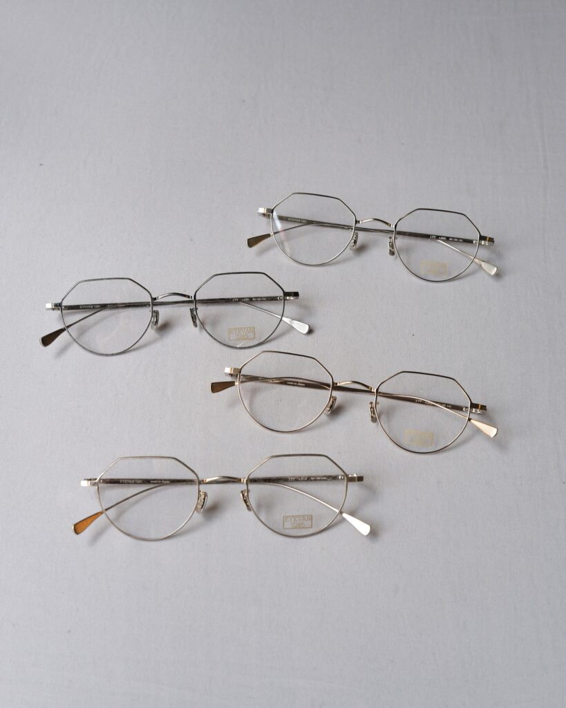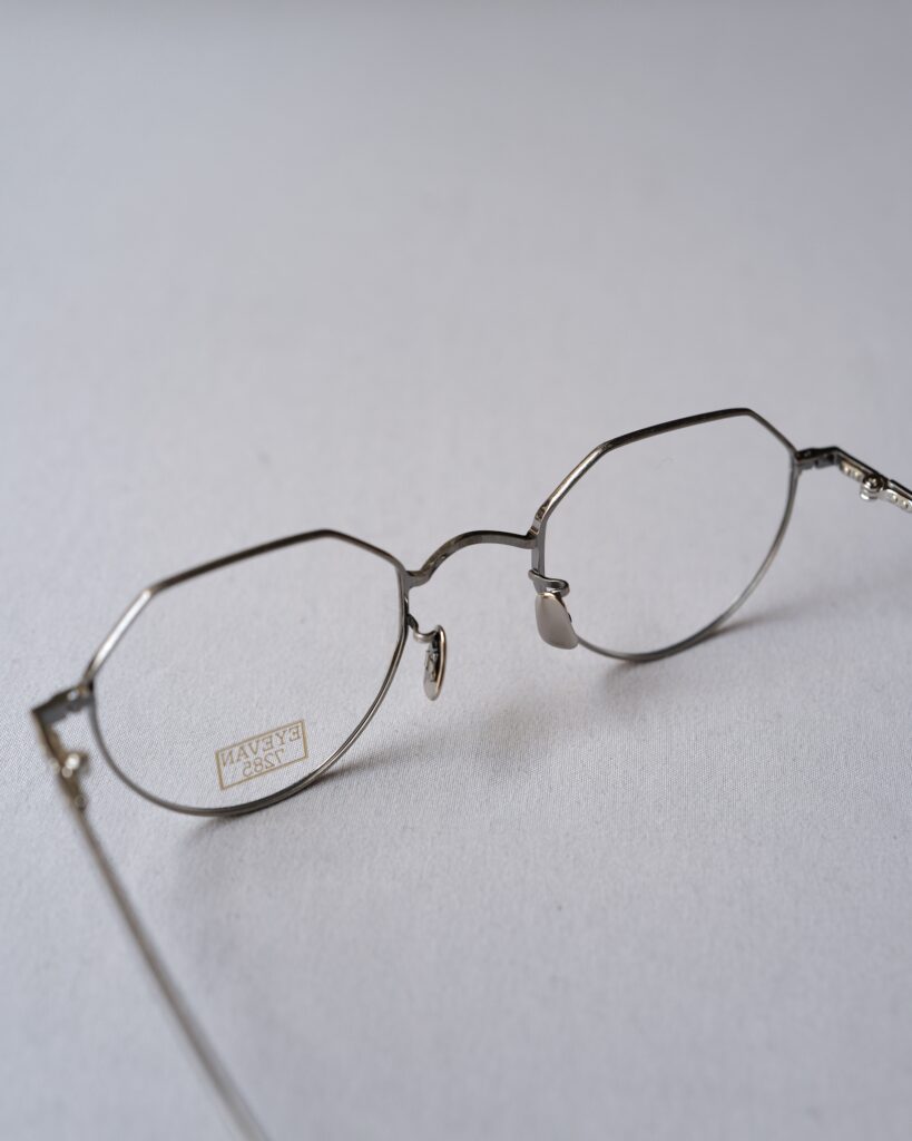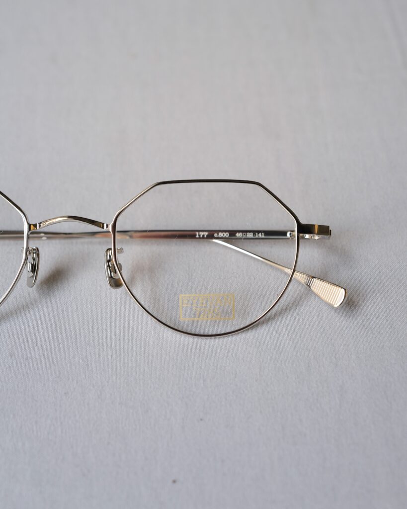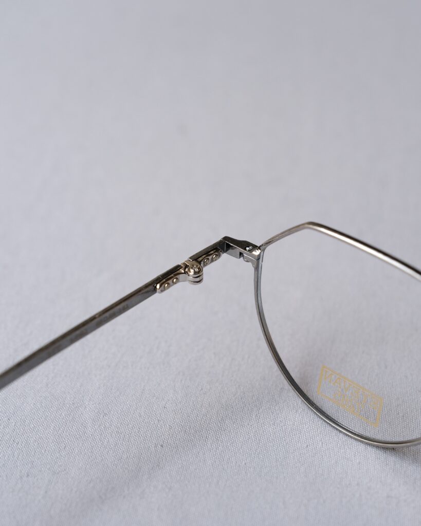 1940年代のヴィンテージのカタログからサンプリングした玉型をチタンのシートメタルで表現したモデル。フロントのシートメタルを別のパーツとロウ付けしたシャープでコンパクトな智、サンプラチナの飾りカシメで固定した蝶番など、非常に細かい中に技巧を凝らした印象です。