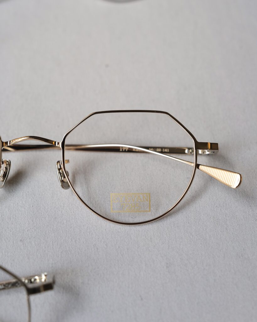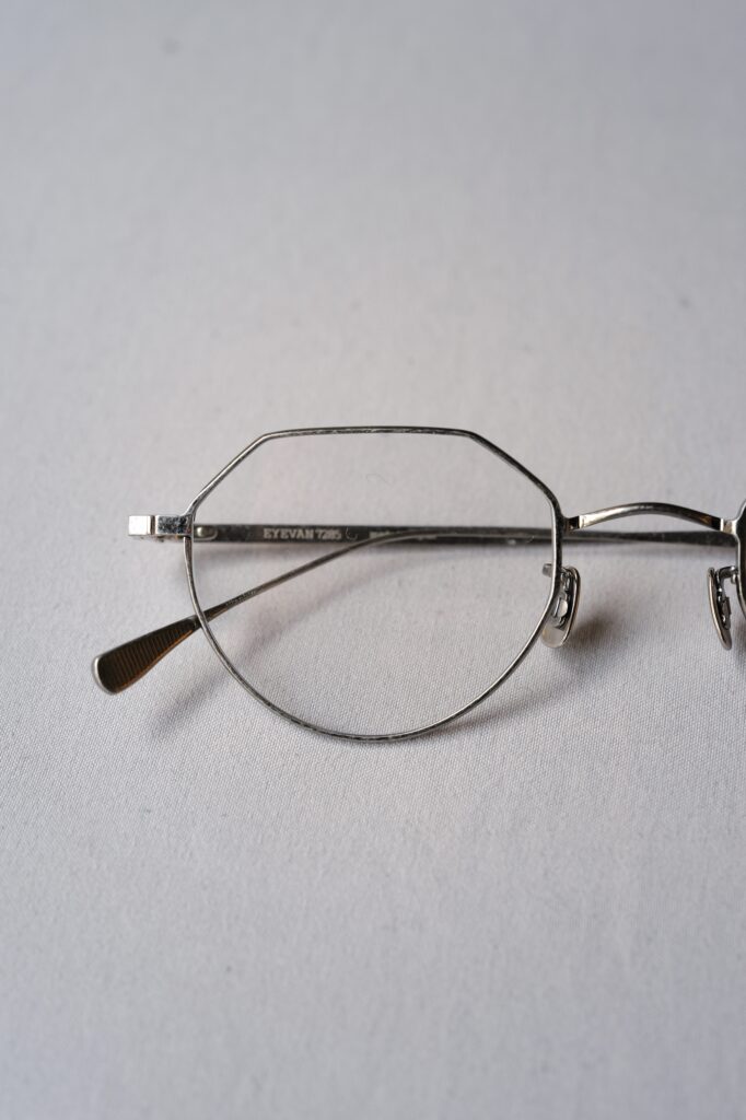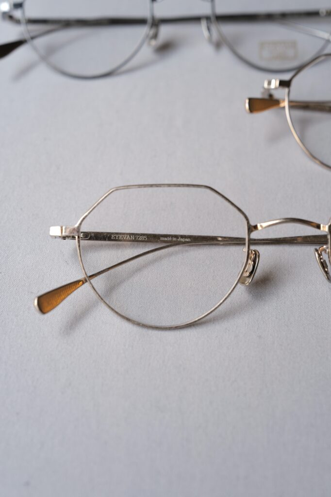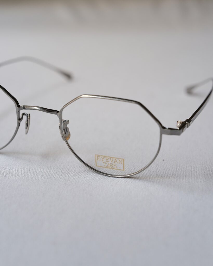 繊細なアウトラインの一方で、前後の重量バランスを考慮してたっぷりと膨らんだテンプルエンドなど、機能的な要請があってこそのディテールもEYEVAN 7285らしく目を惹きます。全てのデザインに理由がありながら、それが決して前に出過ぎない、非常に馴染みのよい一本です。
